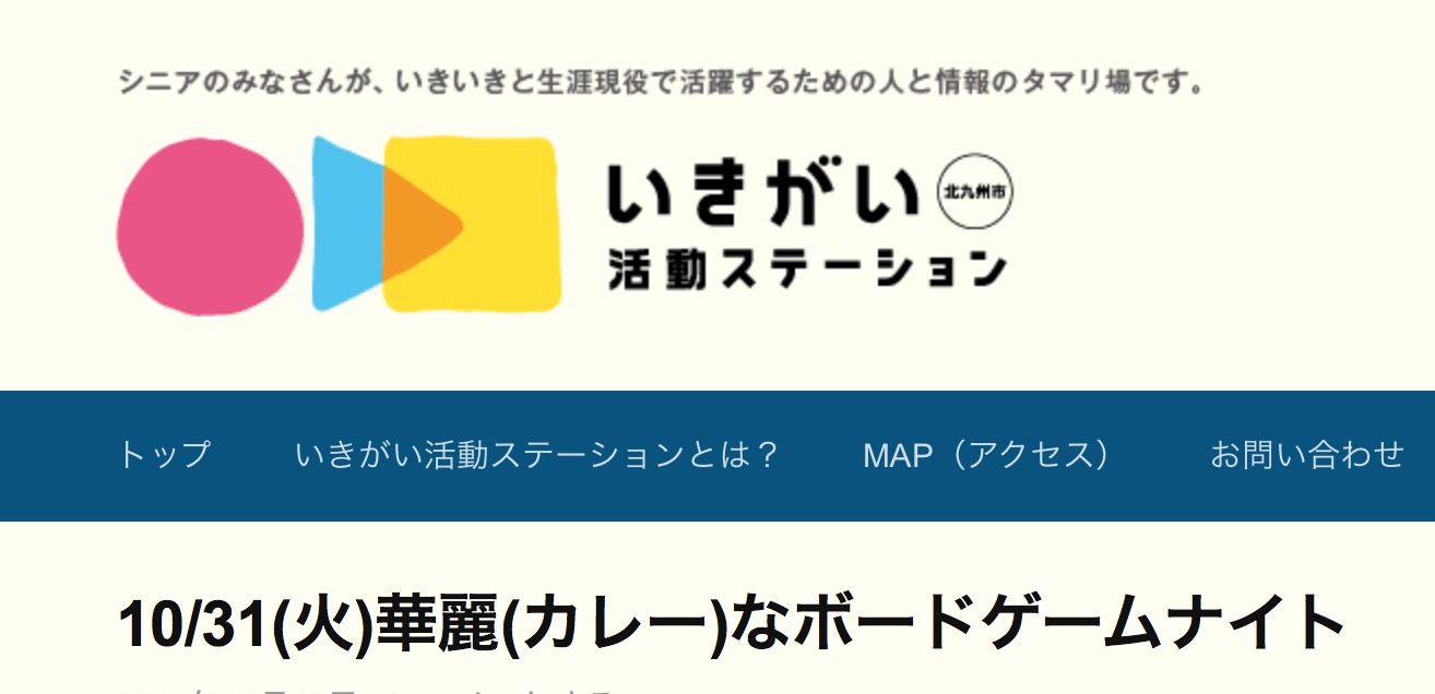 シニアの「生きがい」×「役割」×「交流」を創出し、生涯現役の社会づくりを北九州で進めている”北九州いきがい活動ステーション”にて「華麗(カレー)なボードゲームナイト」という企画をいただきました。